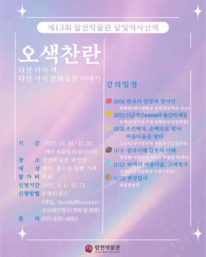 달빛역사산책은 2013년부터 이어져 온 합천박물관의 대표적인 야간 역사문화 강좌로, 지역민들에게 꾸준한 사랑을 받아온 프로그램이다. 올해는 ‘오색찬란 – 다섯 가지 색, 다섯 가지 문화유산 이야기’를 주제로 한국 문화유산 속 다섯 가지 색을 중심으로 역사.미술.고고학 분야 전문가들이 강연을 펼치며, 색을 매개로 문화유산의 의미를 새롭게 조명한다.