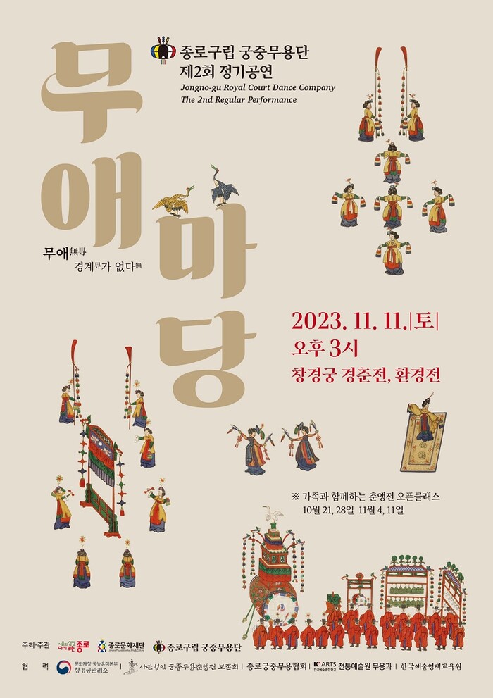 [시민일보 = 이대우 기자] 서울 종로구(구청장 정문헌)가 오는 11일 창경궁에서 종로구립 궁중무용단 제2회 정기공연 ‘무애마당’을 개최한다.