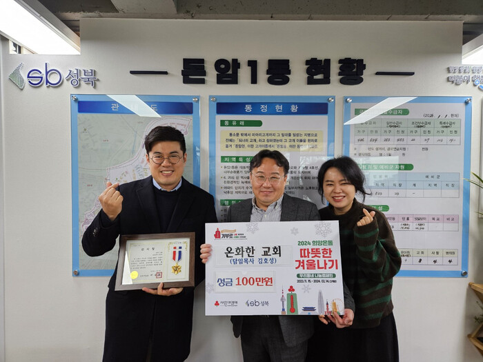 [시민일보 = 홍덕표 기자] 서울 성북구(구청장 이승로) 소재 온화한 교회가 최근 돈암1동 주민센터를 찾아 따뜻한 겨울나기 성금 100만원을 기탁했다.