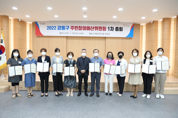 서울 강동구는 지난 20일 올해 첫 주민참여예산위원회 총회를 개최했다. 1차 총회에서는 신규 위원 14명에 대한 위촉식과 함께 내년에 편성될 주민참여예산 관련 안건 등을 심사하기 위한 임원진 선출 및 분과위원회가 구성됐으며 전문가의 특강으로 예산 교육도 진행됐다. 사진은 총회에서 단체 기념촬영을 하는 모습. (사진제공=강동구청)