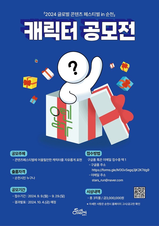 이번 공모전은 콘텐츠 페스티벌 사전 붐업의 일환으로 순천 시민들이 직접 그린 캐릭터를 지역 대학 웹툰ㆍ애니메이션 학과의 학생들이 보완하고, 기업이 참여해 상품화하는 지산학 협업 프로젝트 차원에 의미를 두고 진행된다.