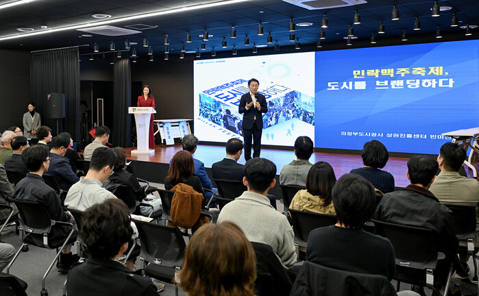 경기 의정부시가 최근 의정부문화역 이음에서 ‘민락맥주축제 콘텐츠 혁신 세미나’를 개최하고, 축제 콘텐츠 고도화와 지역관광 활성화 방안을 심도 있게 논의했다. 사진은 김동근 시장이 세미나에서 인사말을 하는 모습. (사진=의정부시청 제공)