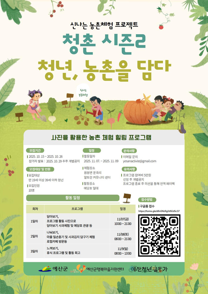 주요 일정은 응봉면 운곡리 알토란사과마을(알토란커뮤니티센터)을 거점으로 진행되며, 마을 일손 돕기와 다양한 체험 프로그램을 비롯해 예당호 일원의 관광ㆍ힐링 프로그램 등이 함께 운영될 예정이다.