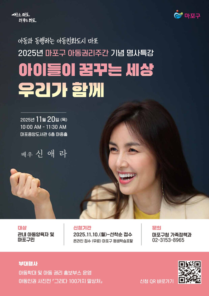 박강수 구청장은 “아동권리주간을 맞아 아동의 권리를 존중하고 보호하는 사회적 분위기를 더욱 확산하기 위해 명사 특강을 준비했다”라며 “특강이 아동 권리에 대한 이해를 높이고, 건강한 양육 환경을 만들어 가는 데 큰 도움이 되길 기대한다”라고 말했다.
