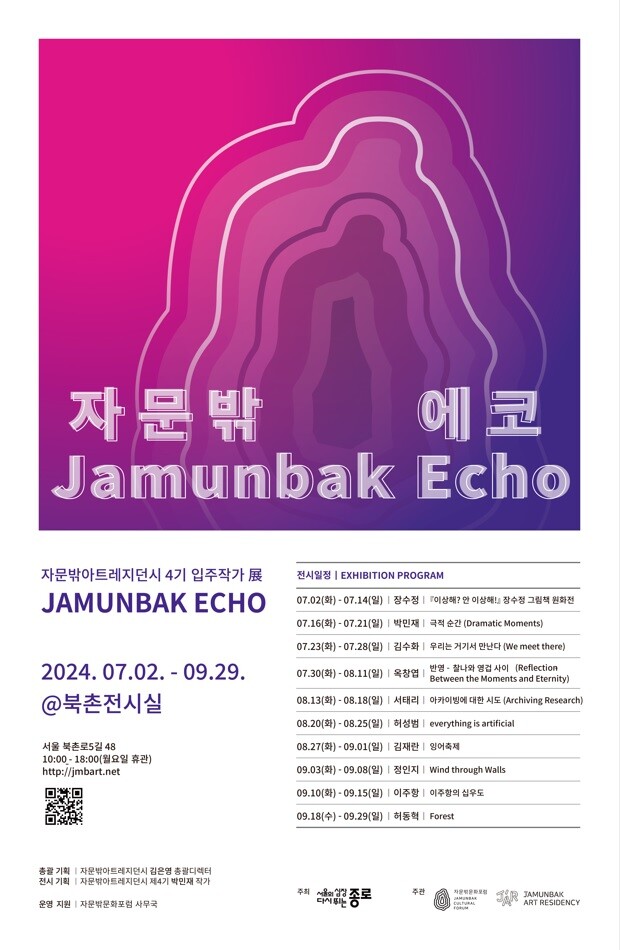 [시민일보 = 이대우 기자] 서울 종로구(구청장 정문헌)가 오는 9월29일까지 북촌전시실(북촌로5길 48)에서 자문밖 아트레지던시 4기 입주작가들의 릴레이 전시회 ‘자문밖 에코 JAMUNBAK ECHO’를 개최한다.