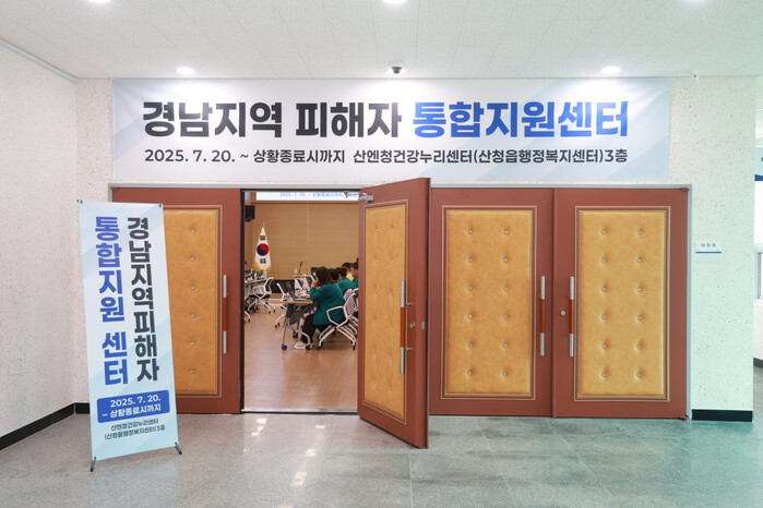 산엔청건강누리센터(산청읍사무소) 3층에 위치하고 있는 지원센터는 중앙기관과 군이 협업해 범정부 산불 피해자 원스톱 지원체계를 구축해 운영한다.
