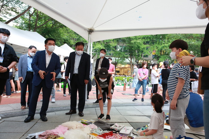 서울 구로구가 지난 22일 주민주도형 마을장터 ‘별별시장’을 개최했다. 이달을 시작으로 9~11월 3개월간 매달 1회씩 구로근린공원과 오류역문화공원을 번갈아가며 열릴 예정이며, 행사에서는 중고물품을 판매·교환하는 벼룩시장, 수공예품을 판매하는 손수시장 등이 진행됐다. 사진은 문헌일 구청장(왼쪽 두 번째)이 벼룩시장을 둘러보고 있는 모습. (사진제공=구로구청)