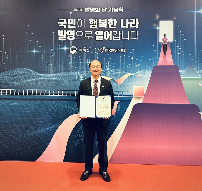 | ▲ 발명의 날 기념식에 참석한 오스템임플란트 특허실 문석기 이사가 기념촬영을 하고 있다. (사진= 오스템임플란트 제공) |