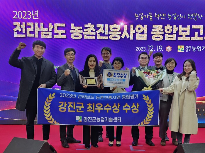 [강진=정찬남 기자] 전남 강진군이 지난 19일 ‘2023년 전라남도 농촌진흥사업 종합평가’에서 강진군농업기술센터가 최우수상(상사업비 1000만원ㆍ시상금 500만원)을 수상했다고 밝혔다.
