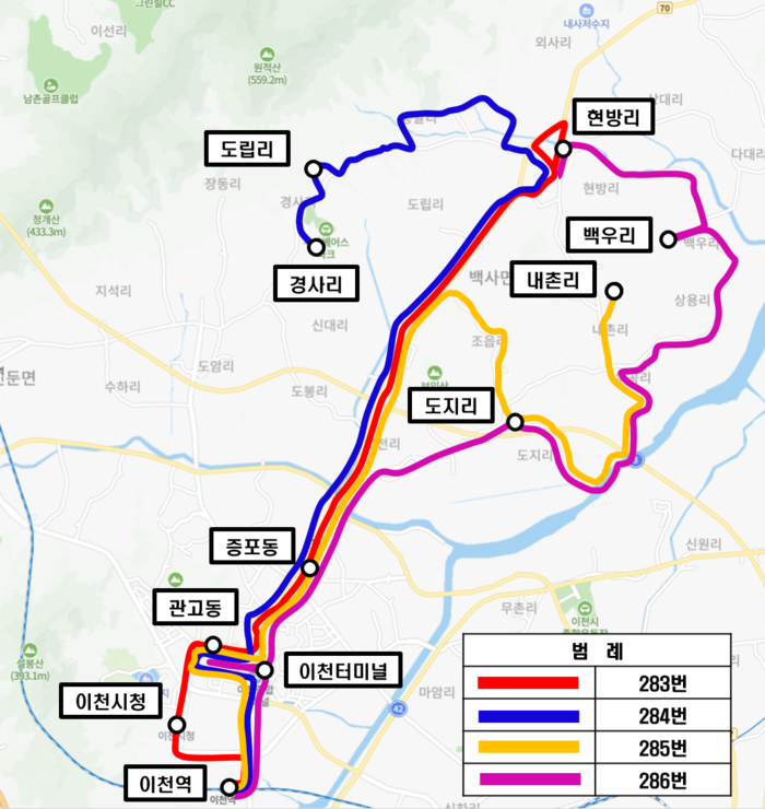 주 노선인 283번 시내버스는 이천역에서 출발해 이천시청, 관고동, 증포동을 거쳐 백사(현방리)로 이동하고 30~50분 배차간격으로 운행하며, 보조노선이 유기적으로 구성·운영됨으로써 백사면(현방리)-증포동-시내권 구간은 배차간격이 평균 15~20분으로 개선될 전망이다.