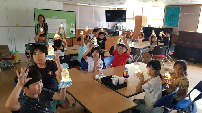 수업은 버려지는 양말목과 학생들이 마신 음료수병을 재활용해 발광다이오드(LED) 감성 랜턴을 만드는 체험형 환경 교육으로 진행됐으며, 매곡초등학교 1~6학년 50여명의 학생이 참여했다.