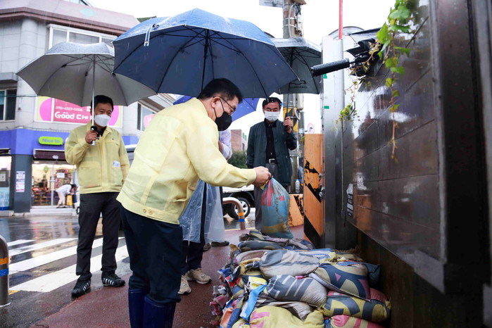 문헌일 서울 구로구청장이 태풍 ‘힌남노’ 북상에 따른 대비 태세를 점검하기 위해 5일 지역내 재난취약시설을 중심으로 현장점검을 했다. 사진은 문 구청장(가운데)이 목감천 개웅교를 찾아 현장을 점검하고 있는 모습. (사진제공=구로구청)