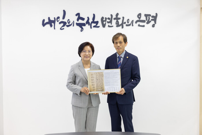 | ▲ 이준 황손(오른쪽)으로부터 대동단 독립선언서 영인본을 전달받은 김미경 구청장(왼쪽). (사진=은평구청 제공) |
