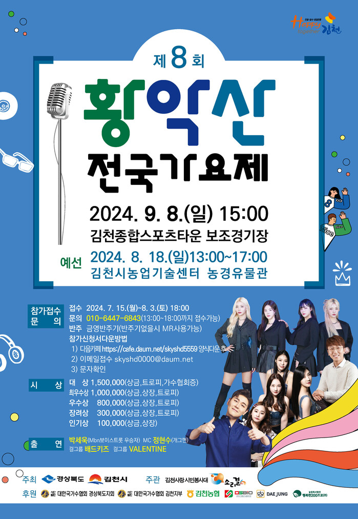 [김천=박병상 기자] 경북 김천시(시장 김충섭)는 신인 가수 발굴 및 시민들의 문화예술 향유 기회 확대를 위한 「제8회 황악산 전국 가요제」를 개최한다고 밝혔다.