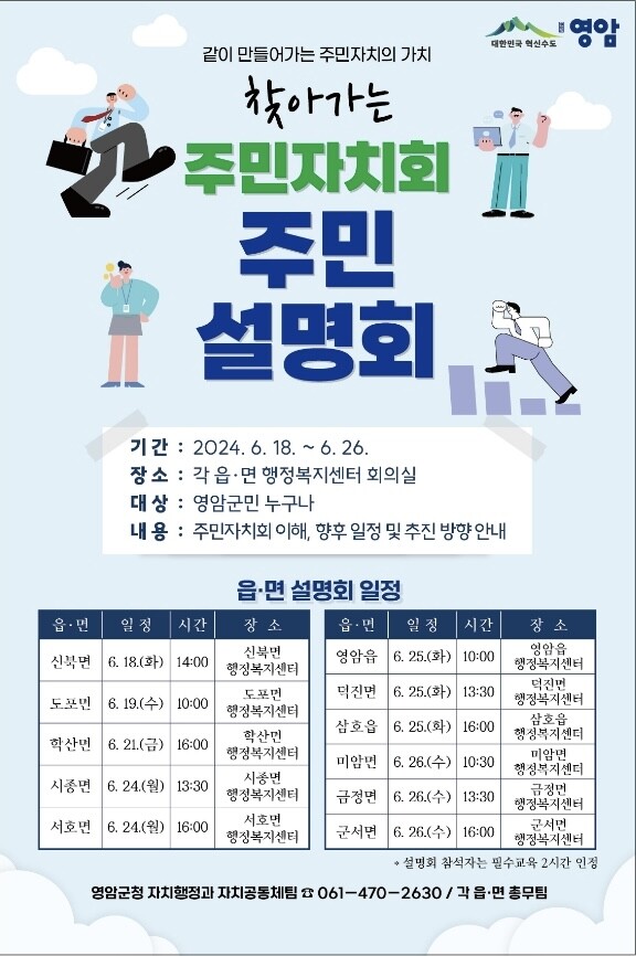 주민자치회 읍ㆍ면 설명회는 19일 도포면, 21일 학산면, 24일 시종ㆍ서호면, 25일 영암ㆍ삼호읍ㆍ덕진면, 26일 미암ㆍ금정ㆍ군서면으로 이어진다.