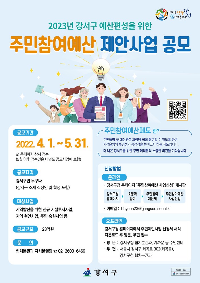 구민이라면 누구나 공모에 참여할 수 있으며, 오는 4월1일부터 5월31일까지 구 홈페이지 '소통과 참여→주민참여예산제'를 통한 온라인 신청이나 우편(강서구 화곡로 302, 강서구청 협치분권과) 또는 이메일(hhyeon23@gangseo.seoul.kr)로 신청하면 된다.