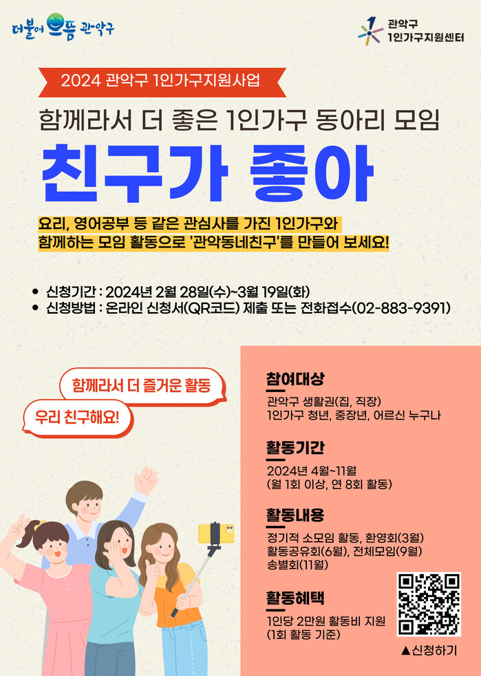 [시민일보 = 여영준 기자] 서울 관악구(구청장 박준희)는 1인가구 맞춤형 지원사업의 일환으로 지역 내 사회적 관계망 형성과 확대를 지원하는 1인가구 동아리 ‘친구가 좋아’ 참여자를 오는 19일까지 모집한다고 밝혔다.