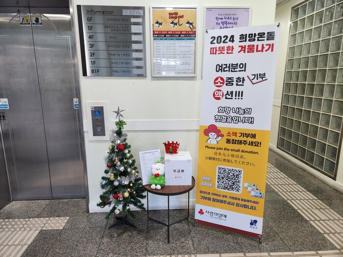 이를 위해 주민센터 2층에 기부 포토존을 만들고, 1층에 소액기부 동참을 알리는 배너를 비롯해 크리스마스트리, 모금함을 설치했다.