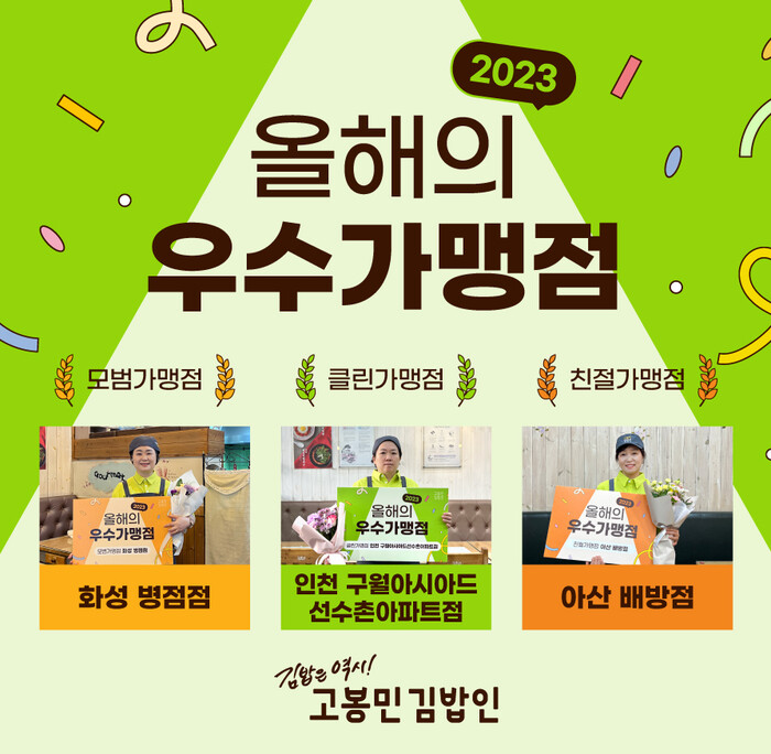 올해 우수가맹점은 ▲본사 레시피를 준수하고 품질 관리에 앞장선 ‘모범가맹점’에 화성병점점 ▲매장 위생 관리가 우수한 ‘클린가맹점’에 인천구월아시아드선수촌아파트점 ▲매장 방문 고객들의 추천을 받은 ‘친절가맹점’에 아산배방점이 선정됐다.