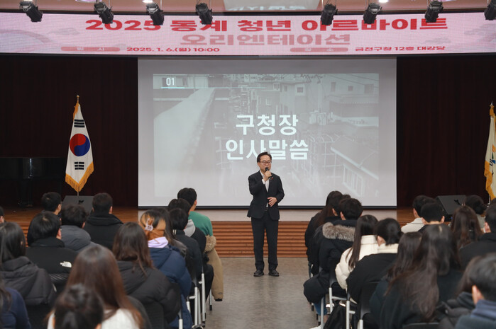 | ▲ 유성훈 구청장이 2025년 동계 청년 아르바이트 오리엔테이션에서 참여 청년들을 격려하고 있다. (사진=금천구청 제공) |