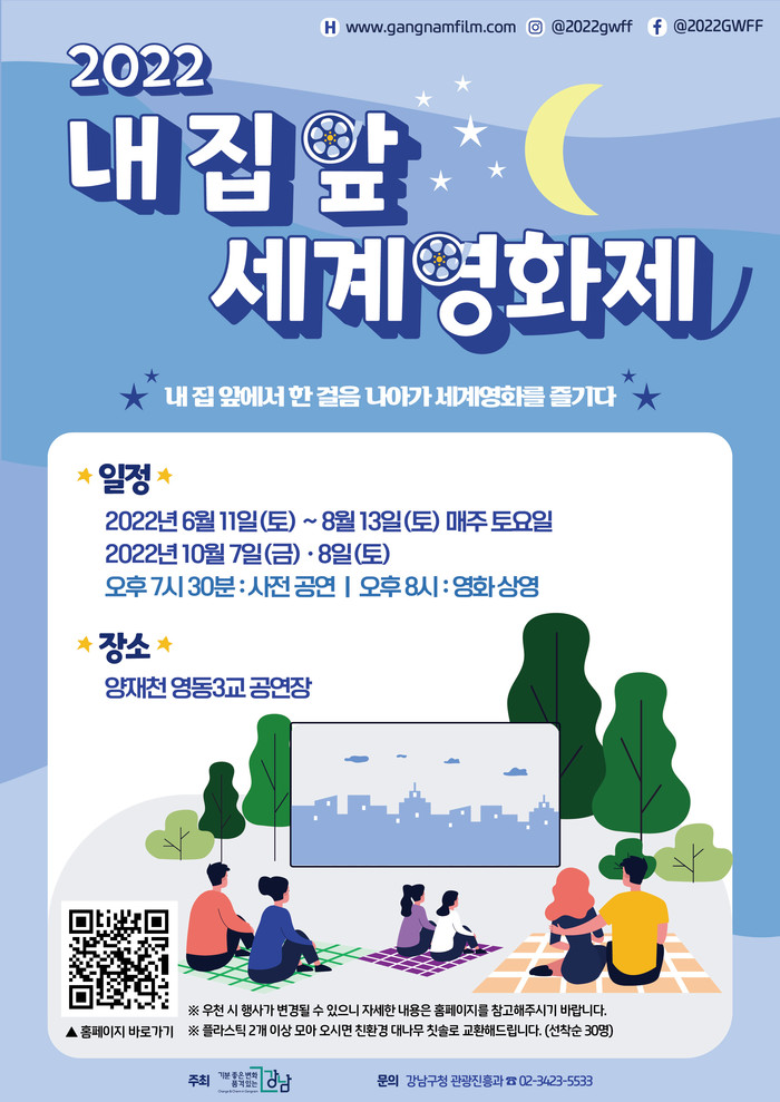 홍종남 관광진흥과장은 “올해로 4년째 열리는 ‘내 집 앞 세계영화제’가 아름다운 양재천변에서 가족과 이웃이 문화생활을 즐기며 힐링할 수 있는 기회가 되길 바란다”고 전했다.