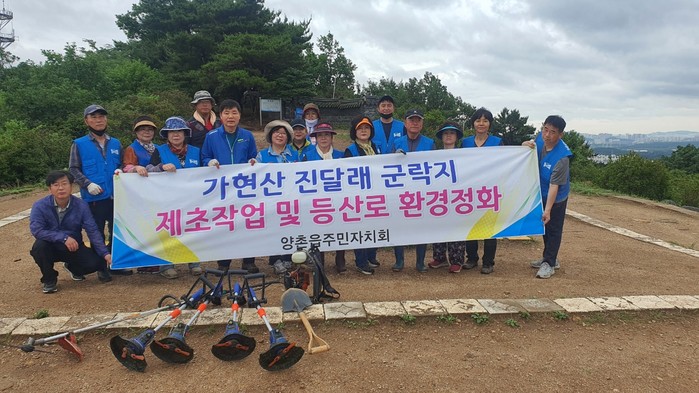 경기 김포시 양촌읍주민자치회는 27일 여름을 대비해 가현산 수애단 진달래 군락지에서 진달래를 감싸고 있는 덩쿨식물 전지작업 및 제초작업을 진행했으며, 등산로 일대 정화 활동을 실시했다. 사진은 이날 참여자들이 기념촬영을 하고 있는 모습. (사진제공=김포시청)
