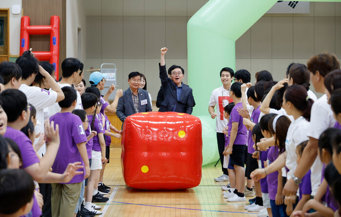 진교훈 서울 강서구청장이 최근 가양레포츠센터에서 열린 ‘다함께 즐거운 강서구 키움 운동회’에 참석했다. 운동회는 아이들과 학부모 300여명이 모여 학년별 대항전, 학부모 참여 경기 등 다양한 프로그램으로 진행됐다. 사진은 진 구청장(정면 왼쪽 두 번째)이 큰 공 굴리기에 참여하는 모습. (사진=강서구청 제공)
