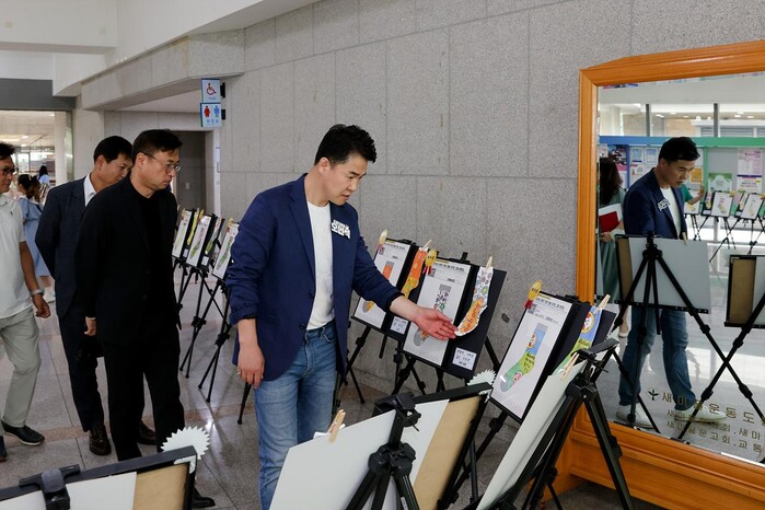 서울 도봉구가 최근 도봉구청 선인봉홀에서 ‘제2회 도봉 양말 디자인 그림 공모전’ 시상식을 개최했다. 사진은 오언석 구청장(오른쪽)이 ‘도봉 양말 디자인 그림 공모전’ 수상작품을 둘러보고 있는 모습. (사진=도봉구청 제공)