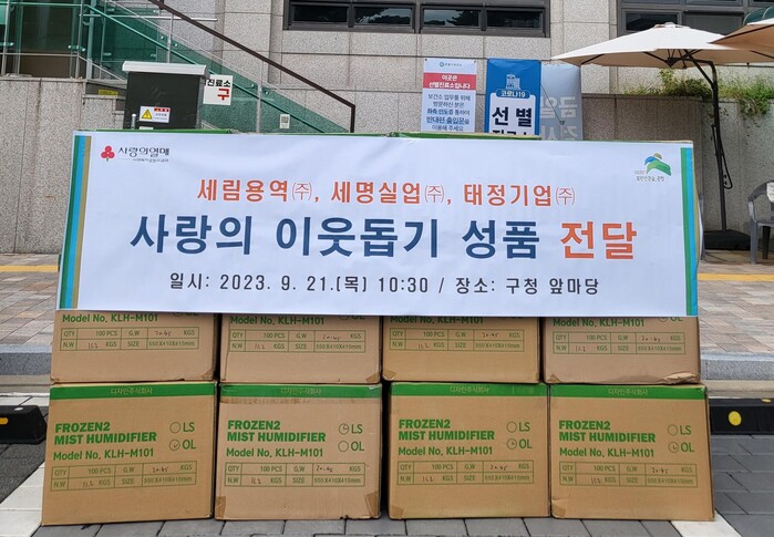 10일 구에 따르면 이들 기업은 1000만원 상당 가습기 2500개를 전달했으며, 이번에 전달 받은 성품은 지역내 저소득 가구 및 사회복지시설에 지원됐다.