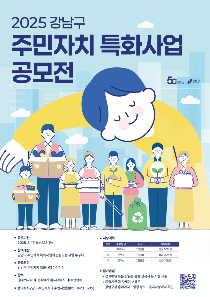 [시민일보 = 이대우 기자] 강남구(구청장 조성명)가 17일~4월18일 ‘2025 강남구 주민자치 특화사업 공모전’ 접수를 받는다.