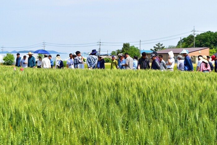 | ▲ 광주광역시농업기술센터, 농촌진흥청 국립식량과학원과 20일 농업기술센터 노지 스마트농업 테스트베드에서 ‘밀 품종 비교전시포 현장평가회’ 개최 / 광주광역시 제공 |
