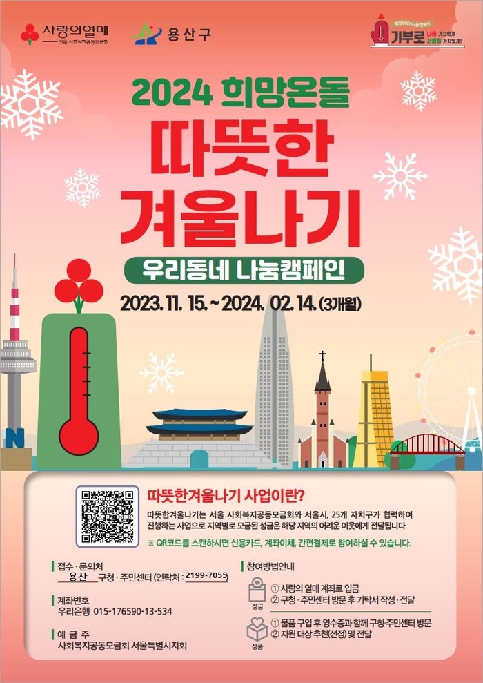 [시민일보 = 홍덕표 기자] 서울 용산구(구청장 박희영)가 오는 2024년 2월14일까지 3개월 동안 '2024 희망온돌 따뜻한 겨울나기' 사업을 추진한다.