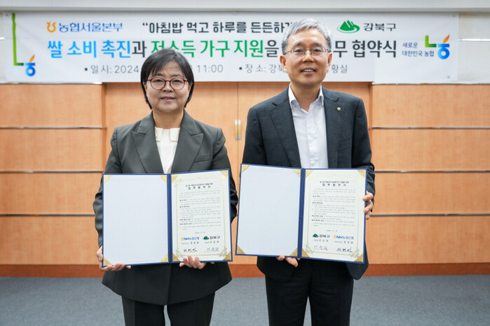 [시민일보 = 문민호 기자] 서울 강북구(구청장 이순희)는 최근 NH농협은행 서울본부와 쌀 소비 촉진과 저소득가구 지원을 위한 업무협약을 체결했다고 19일 밝혔다.