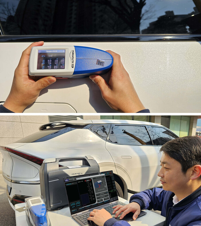 | ▲ 칼라나비플러스로 자동차 외장을 측색하는 모습(상), 측색 후 색상 데이터를 확인하는 모습(하). (사진=KCC 제공) |