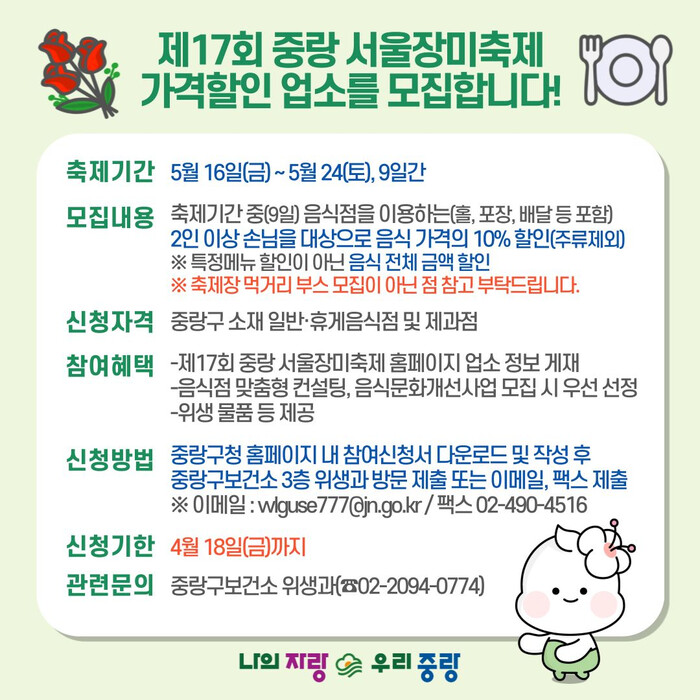 [시민일보 = 여영준 기자] 중랑구(구청장 류경기)가 중랑 서울장미축제를 함께할 ‘장미축제 가격할인업소’를 모집한다.
