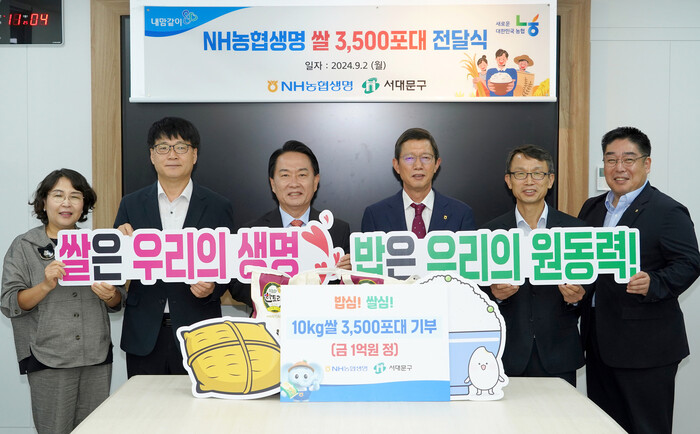 [시민일보 = 이대우 기자] 서울 서대문구(구청장 이성헌)가 NH농협생명으로부터 최근 취약계층 주민을 위한 10kg 쌀 3500포대(약 1억원 상당)를 기탁받았다고 4일 밝혔다.