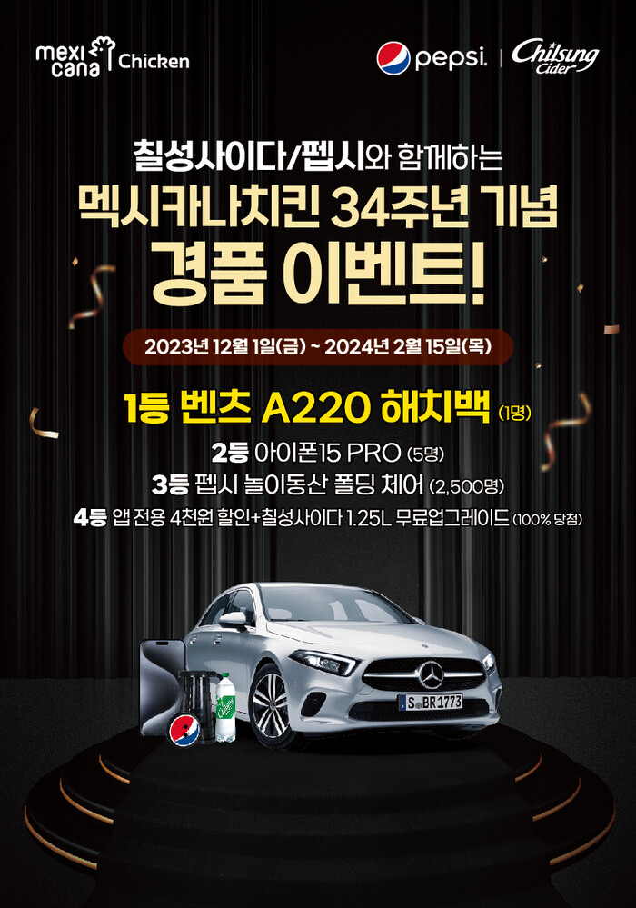 이벤트 기간은 12월 1일부터 24년 2월 15일까지로 ▲1등 벤츠 A220 해치백(1명) ▲2등 아이폰15 PRO(5명) ▲3등 펩시 놀이동산 폴딩 체어(2500명) ▲4등 멕시카나 앱 전용 4천원 할인+칠성사이다 1.25L 무료 업그레이드(100% 당첨)를 증정한다.