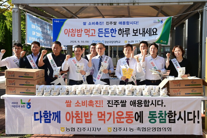 진주시와 농협 진주시지부는 10일 지역 내 거점국립대학교인 경상국립대에서 쌀 홍보 부스를 설치하고 범국민 운동으로 추진 중인 우리쌀 소비촉진 행사와 함께 아침 밥먹기 캠페인을 전개했다.