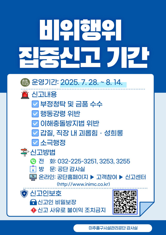 [인천=문찬식 기자] 인천 미추홀구시설관리공단(이사장 박종구, 이하 공단)은 여름 휴가철을 맞아 공직기강 해이를 방지하고 청렴한 조직문화를 조성하기 위해 오는 8월 14일까지 ‘하계 휴가철 비위행위 집중 신고 기간’을 운영한다.