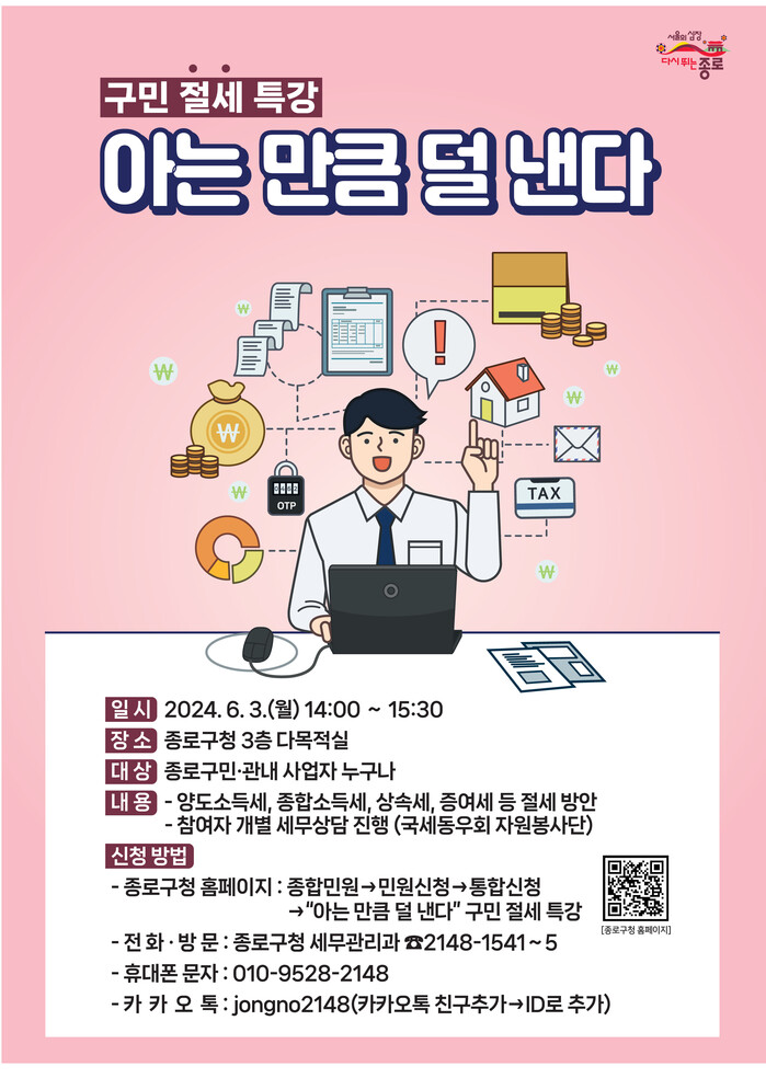 [시민일보 = 이대우 기자] 서울 종로구(구청장 정문헌)가 오는 6월3일 오후 2시~3시30분 구청사 3층 다목적실에서 ‘아는 만큼 덜 낸다’ 구민 절세 특강을 진행한다.