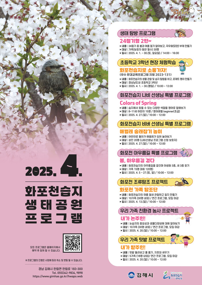 4월 프로그램은 ▲24절기 기행 2탄 : 봄과 여름 ▲초등학교 3학년 현장체험학습 : 화포천 습지로 소풍가자 ▲친환경 농사 프로젝트 : 내가 논 주인 & 우리가족 텃밭 프로젝트 ▲특별프로그램 : Colors of Spring, 애벌레 술래잡기 놀이 ▲화포천 탐조 및 아우름길 걷기이다.