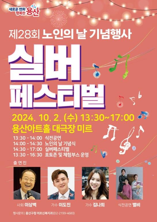 [시민일보 = 문민호 기자] 서울 용산구(구청장 박희영)가 제28회 노인의 날을 맞이해 오는 10월2일 오후 1시30분 용산아트홀(녹사평대로 150) 대극장 미르에서 기념행사를 개최한다.