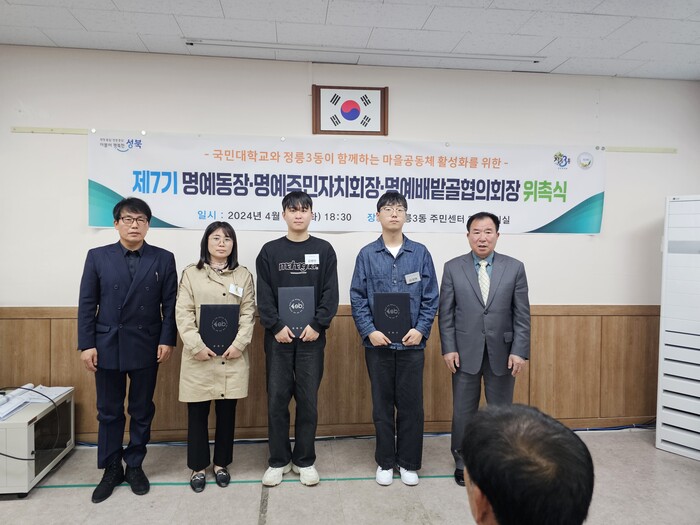 [시민일보 = 여영준 기자] 서울 성북구(구청장 이승로)는 최근 정릉3동 주민센터에서 국민대학교와 정릉3동 지역사회가 공동 주최하는 ‘제7기 명예동장·명예주민자치회장·명예배밭골협의회장 위촉식’이 열렸다고 18일 밝혔다.