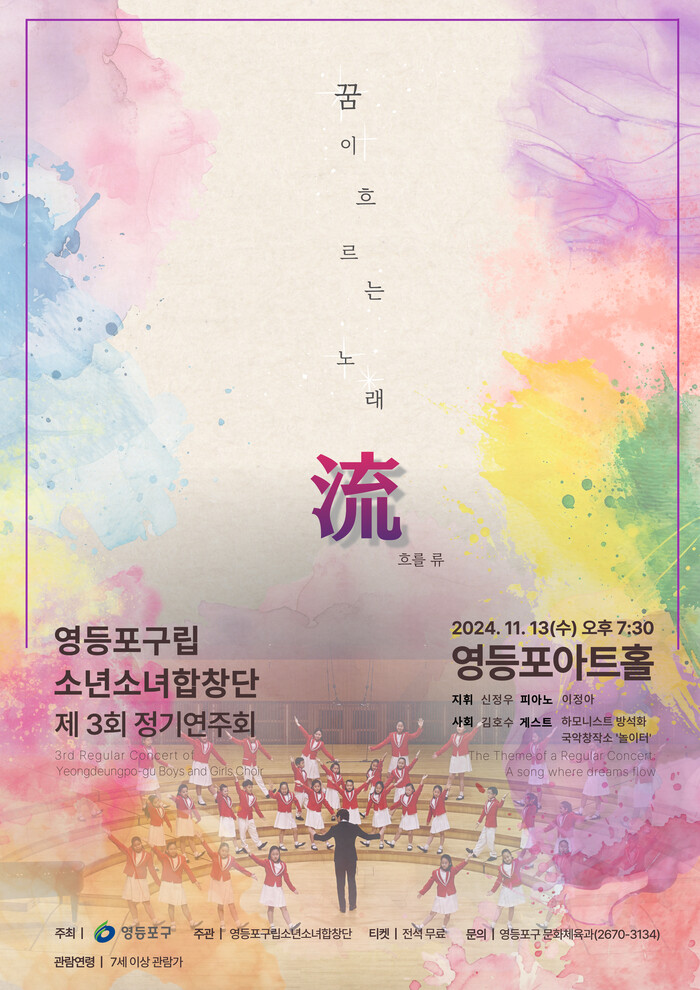 이어 13일에는 구립 ‘소년소녀합창단이’ 구민 여러분을 초대한다. 이번 정기연주회는 오후 7시 30분 영등포 아트홀에서 진행되며, ‘꿈이 흐르는 노래 流(류)’라는 주제로 아이들의 꿈과 희망을 담아 감동의 메시지를 전한다.