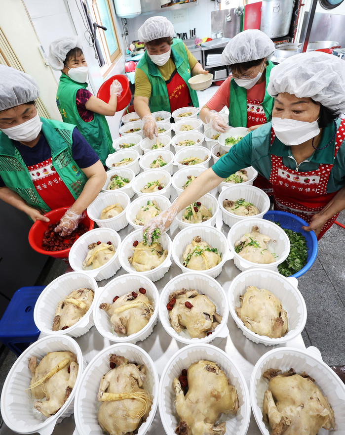 12일 오전 경기도 수원시 권선구 평동 행정복지센터에서 평동주민자치위원회 주최로 열린 '2022년 복달임 행사'에서 평동새마을부녀회 회원들이 지역내 취약계층에게 전달할 삼계탕을 만들고 있다.