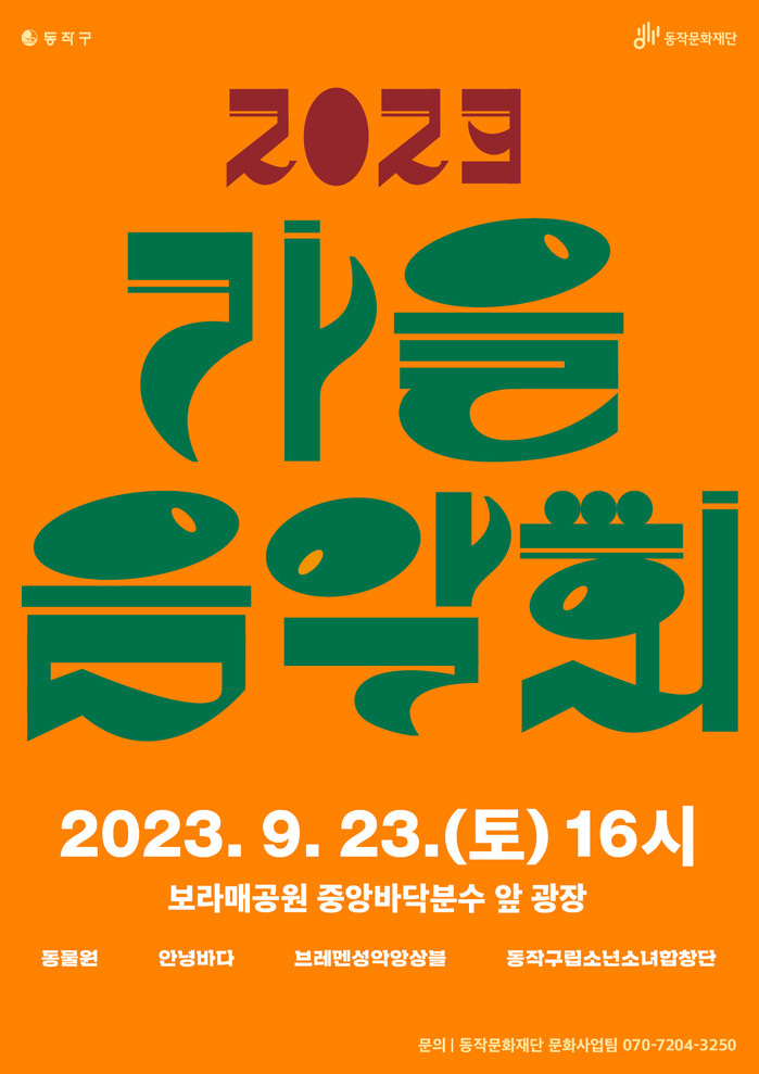 [시민일보 = 여영준 기자] 서울 동작구(구청장 박일하)가 오는 23일 오후 4시 보라매공원 중앙바닥분수 앞 광장에서 ‘2023 가을음악회’를 개최한다.