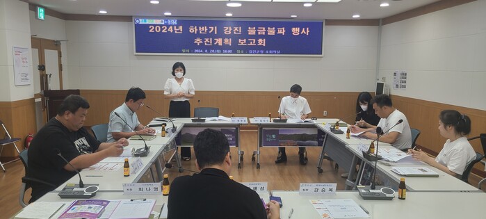 군은 하반기 행사를 위해 지난 20일 군청 소회의실에서 부서별 관계자 9명이 참석한 가운데 ‘2024년 하반기 강진 불금불파 행사 추진 보고회’를 가졌다. 이번 보고회는 각 부서별 추진 계획을 보고하고, 문제점 및 대책을 함께 강구하고, 보완할 사항 등을 점검하고자 마련됐다.