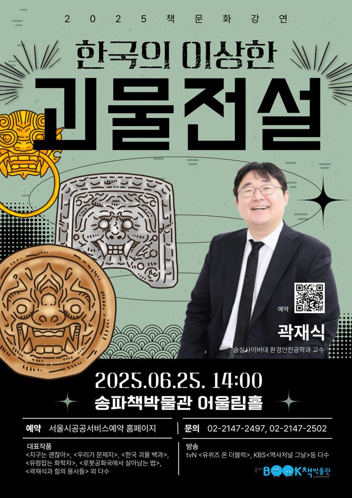 올해 첫 강연 주인공은 공학박사이자 소설가로 활약 중인 곽재식 숭실사이버대학교 환경안전공학과 교수로, ‘한국의 이상한 괴물전설’을 주제로 2008년부터 수집해 온 한국의 괴물 이야기를 풀어내 전통 설화 속 괴물을 과학적 관점에서 재해석해 줄 계획이다.