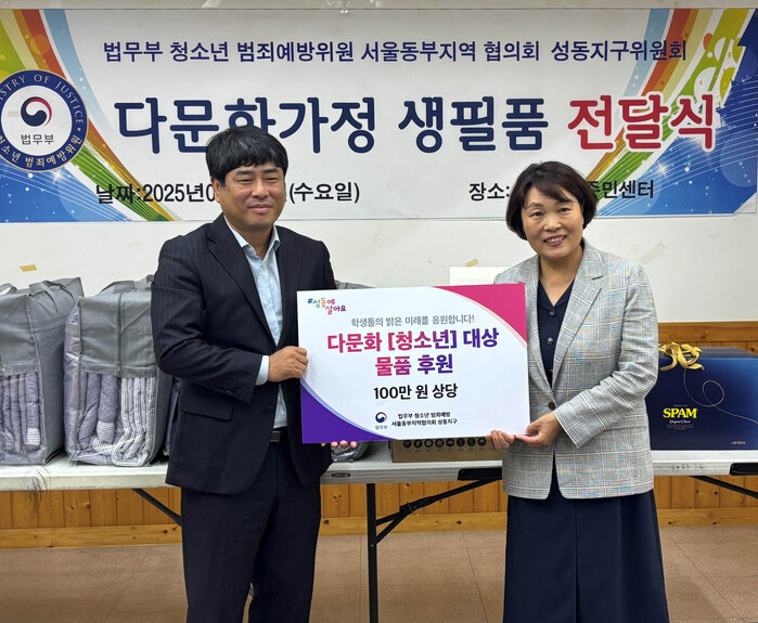 [시민일보 = 박소진 기자] 성동구(구청장 정원오) 행당제1동은 지난 24일 법무부 청소년 범죄예방 서울동부지역협의회 성동지구와 협력해 다문화가정 청소년에게 100만원 상당의 물품을 전달했다.