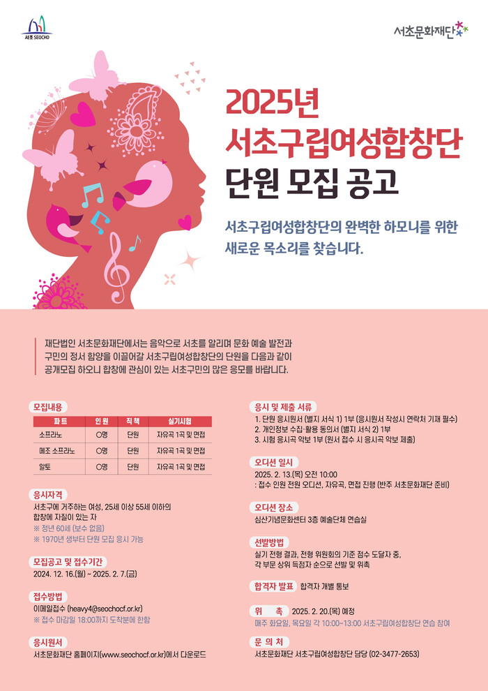 [시민일보 = 박소진 기자] 서울 서초구(구청장 전성수)와 서초문화재단은 2025년 새해를 맞아 서초구립여성합창단의 신규단원을 모집한다고 8일 밝혔다.